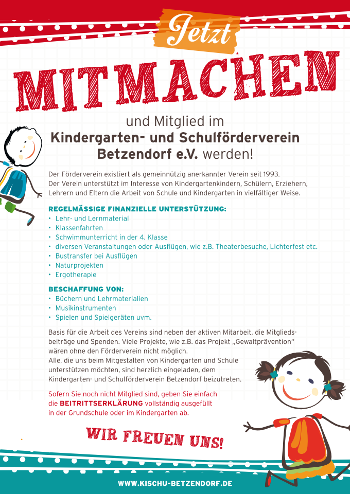Sofern Sie noch nicht Mitglied sind, laden Sie sich einfach die Beitrittserklärung herunter geben Sie sie bitte vollständig ausgefüllt in der Grundschule oder im Kindergarten ab.